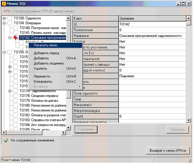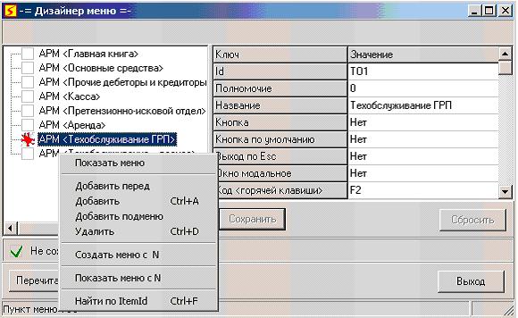 Все следующие меню открываются в однотипных экранах, описанных ниже. Создание, редактирование и удаление пользовательских АРМов из главного меню данного АРМа полностью аналогично соответствующим операциям над пунктами пользовательского меню, открытого в следующем экране АРМа, за исключением того, что для пользовательского АРМа следует указывать только Id и название пункта меню, остальные реквизиты игнорируются. Ниже приведен экран, в котором редактируется пользовательское меню. Идентификатор меню соответствует идентификатору пункта меню, при помощи которого был открыт экран, на котором обозначенное меню расположено. Идентификатор главного меню пользовательского АРМа соответствует идентификатору АРМа. Идентификатор редактируемого меню отображается в заголовке экрана. Ниже, в специальной панели, отображается путь, по которому можно дойти до данного меню, начиная от главного меню пользовательского АРМа. Сам экран, в котором редактируется меню, разбит на два поля. В левом поле в виде дерева отображается структура текущего меню. В правом поле отображаются реквизиты текущего пункта меню. Реквизиты пункта меню и правила их заполнения приведены ниже. При помощи выпадающего меню экрана можно: